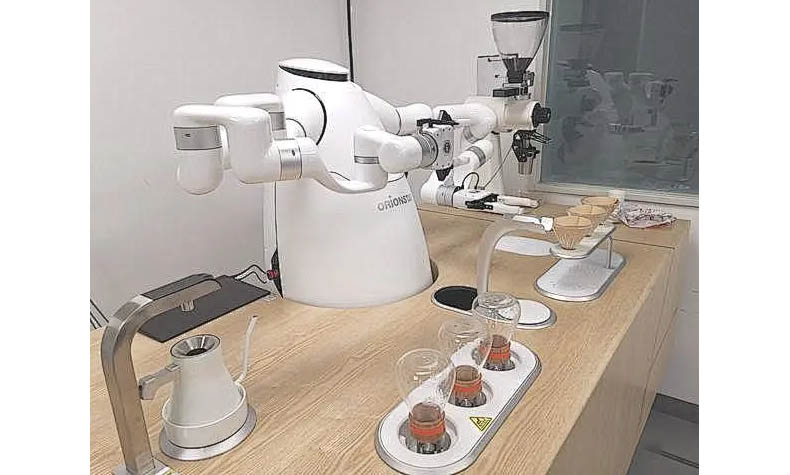 智能咖啡設(shè)備(大白機(jī)器人)也被安置于媒體中心提供服務(wù)。智能咖啡設(shè)備其實(shí)是一個(gè)雙臂協(xié)作機(jī)器人。據(jù)了解,大白機(jī)器人由兩條六軸協(xié)作式機(jī)械臂組成,左右機(jī)械臂可以同時(shí)開工,能精準(zhǔn)執(zhí)行各種不同的動(dòng)作。可完成取豆、稱重、取水、上水、沖泡等一系列咖啡制作工藝。大白機(jī)器人復(fù)刻了大師級(jí)手沖咖啡的流程,能像咖啡大師一樣在進(jìn)行拉花工藝展示的同時(shí)保證每一杯都能達(dá)到最好效果。只需4分鐘,沖咖啡“大師”大白機(jī)器人就可制作一杯醇香的咖啡。