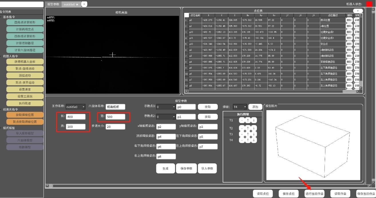 超準(zhǔn)視覺參數(shù)化編程視覺系統(tǒng)采用先進(jìn)的三維圖像處理和算法技術(shù),能夠在短時(shí)間內(nèi)捕捉工件的關(guān)鍵信息。操作工人只需完成一個(gè)簡單的步驟:輸入工件的長、寬和高,一鍵啟動(dòng)(參考上圖),即可完成自動(dòng)焊接。免去了繁瑣的人工示教,真正實(shí)現(xiàn)了雙手解放,極大提高了機(jī)箱機(jī)柜的焊接效率。